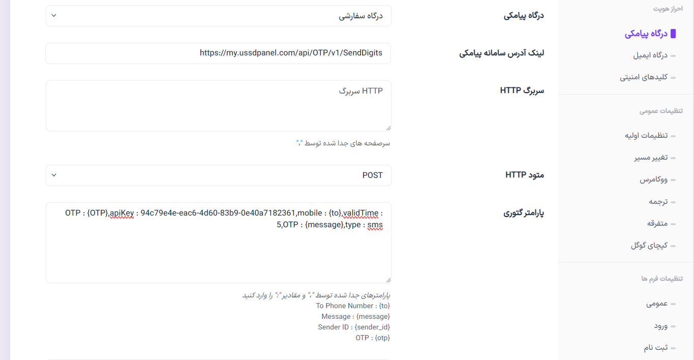 apiKey : API key دریافتی از مستر OTP را دراین قسمت وارد کنید.,